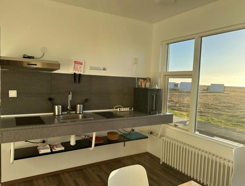 At Starlight Camping Pods, guests can enjoy a unique dining experience with access to a well-equipped shared kitchen. This communal space invites travelers to unleash their culinary creativity while surrounded by the breathtaking landscapes of Skogarfoss, Iceland. The kitchen boasts modern appliances, ample counter space, and all the essential cookware, making it easy for guests to prepare their favorite meals or experiment with local ingredients. Whether you're whipping up a hearty breakfast to fuel your adventures or crafting a cozy dinner under the stars, this kitchen serves as the perfect backdrop for shared culinary moments. In addition to the kitchen facilities, Starlight Camping Pods offers daily housekeeping services, ensuring that your dining experience remains as enjoyable and stress-free as possible. With a clean and tidy environment, guests can focus on savoring their meals and making lasting memories with friends and family. After a day of exploring the stunning natural wonders of Iceland, return to the comfort of your pod and enjoy a delicious meal in the company of fellow travelers, all while soaking in the enchanting atmosphere that only Starlight Camping Pods can provide.